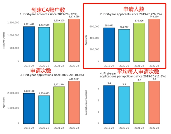 一直以来,国家鼓励广大优秀的青年人才走出去,加大对海外留学人才的引进和服务力度,确立了“支持留学、鼓励回国、来去自由、发挥作用”的新时代留学工作方针。在国家积极信号的释放下,2022-2023申请季,留学申请人数暴增63%!无论是申请人数、申请数量,均出现明显上涨。