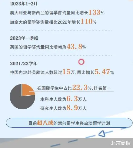 值得关注的是,虽然今年的留学人数和人群有所变化,但最热的留学目的国却未发生改变。众多主流留学目的国中,英国仍然凭借其超高性价比稳坐留学“C位”。“澳大利亚的项目学制一般是一年半到两年,美国的项目大多超过两年,我现在申请的英国一年制授课型硕士,总体花费算下来预计在40万-50万元之间,而且我不在伦敦,生活成本还会再降低一些,如果去美国读书,总体费用几乎要翻倍,“美国两年下来怎么也要花100万元,澳洲会便宜一些,但也贵过英国。”服务数据也显示,2023年一季度,英国留学的咨询量同比增幅为43.8%。同时,英国也已连续五年成为中国学生留学目的地的首选。以2023年的数据为例,38.9%的留学生将英国作为了留学目的地。